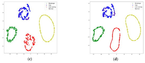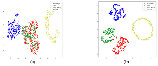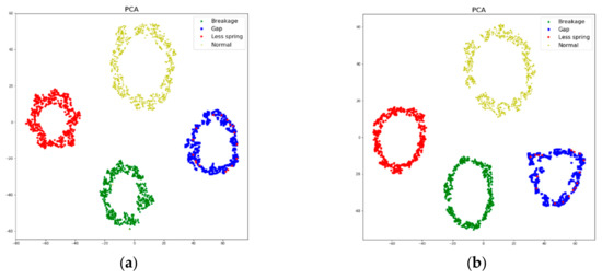The test sets were extracted with different SNR at the output of the dense layer 1 and principal component analysis (PCA) was performed on them to obtain Figure 14. It can be seen that when the SNR is 5 dB, the output of the valve rupture and spring damage faults at the fully connected layer 1 are too close. Consequently, they overlap widely after dimensionality reduction. In addition, the failure data of the spring damage also overlaps with the gap data of the valve plate to a small extent, resulting in a decrease in the accuracy of the model. More spring damage fault data were collected to better extract the characteristics of this type of fault, which can improve model accuracy. When the SNR was 10 db, only a small number of samples were close to the output of the dense layer 1, but the model accuracy was still only 55.59%. Thus, it is judged that the output layer may not be well classified.