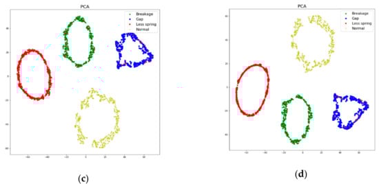 PCA of the output of the test set samples in the dense 1 of the 2-D CNN multi-measurement point model under different noise strengths (a) SNR is 5 dB; (b) SNR is 10 dB; (c) SNR is 20 dB; (d)SNR is 50 dB.