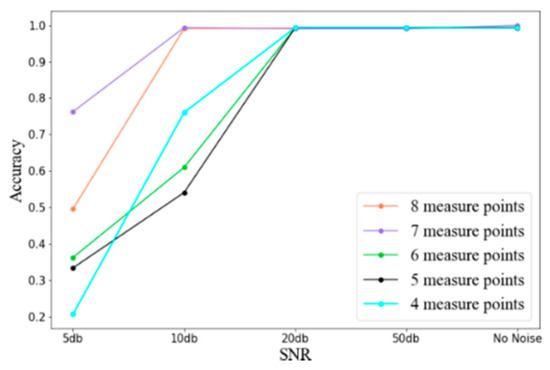 The test set was used to test the multi-point and single-point models of 1-D CNN under different noise intensities and the comparison results are shown in Table 4. It can be seen from Table 5 that the accuracy of the 1-D CNN multi-point model on the test set was reduced, especially when the SNR was reduced to below 20 dB, and the model accuracy was significantly reduced.