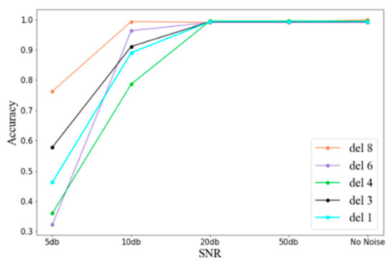 The 2-D CNN model proposed in this section was compared with the first two models. The test set was used to test under different SNR and the comparison results are shown in Table 5 above. As can be seen, the performance of the 2-D CNN multi-measurement point model proposed in this section was significantly improved in the 10 dB SNR over the 1-D CNN multi-measuring point model. However, when the SNR was 5 dB, the accuracy of the 2-D CNN multi-measuring point model was only 49.67%, which is lower than the accuracy of the 1-D CNN single-measurement point model. However, when the SNR was 10 dB, the accuracy was significantly improved compared to the 1-D CNN single-measuring point model, and when the SNR was higher, the two types of models behaved similarly. Therefore, the greater the number of fusion points, the accuracy of the model is not necessarily higher. The next chapter will study the influence of the number of measurement points and the selection of the measuring points on the accuracy of the model.