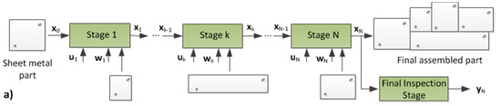In the literature, different models for variation propagation analysis have been studied in MMS. One of these approaches is the so-called stream of variation (SoV) model, proposed in [3] for 2D multistage assembly processes (sheet metal assembly processes) and later on extended for 3D multistage assembly and machining processes [4,5]. The SoV model has been successfully applied in a large number of applications in MMS, especially for product quality assurance [6], process planning [7], and fault diagnosis [8], as well as applications for decision-making and optimization for inspection planning [8,9,10] and quality control and error compensation with the use on shop-floor data in real time [11,12].