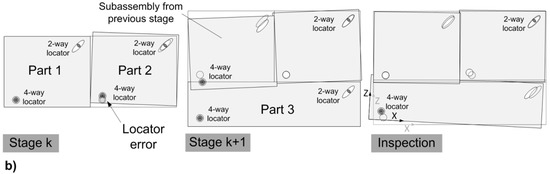 where Yk is the vector that represents the deviation of the features inspected after stage k and, therefore, it is a function of the current deviation of the resulting assembly (Xk) through the matrix Ck plus the measurement error represented by the vector Vk. Both Equations (1) and (2) define the error propagation in MAS of N stages, where k = 1, …, N. An example of MAS and the effect of error propagation is shown in Figure 1, where fixturing is based on 4-way and 2-way locators. As it can be seen, a locator error at stage k produces an error in the resulting subassembly after stage k. Thus, this subassembly enters stage k+1 and, due to relocation error, and even if no fixture or welding error is added, the resulting subassembly after stage k+1 presents a geometric error. Later, at the inspection stage, the assembly is inspected and a quality error is identified. Readers interested in a detailed description of SoV model derivation, please refer to references [3,4,5,18].