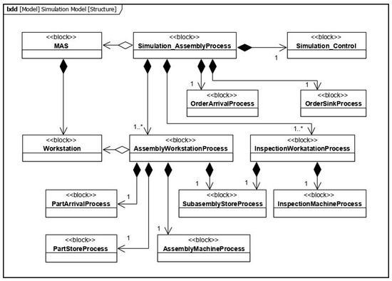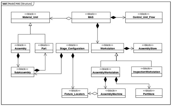 From the above description, the work is clearly focused on a generic MAS with a sequential linear flow of materials through a variable number of stations which allow the processing of the assemblies and their measurement. This MAS is also equipped with a control logic both for the logistics (flow of materials and production orders) and for the assurance and improvement of geometric quality. Therefore, it is a generic MAS type, which can be described with the modular and scalable structure of the meta-model shown in the BDD of Figure 2.