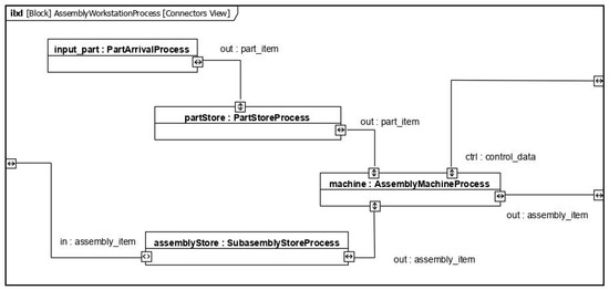 - Assembly_connection. This type of connection contains the data related to the assemblies’ flow. These data include the assembly order, the parts contained, and the types of these parts. Additionally, these connectors include Boolean variables to indicate the discrete external events linking the blocks that participate in the assemblies’ flow. This connector type is represented by a pink line in Figure 8.