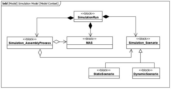 Once the simulation system is modelled, and as indicated in Step 4 of the methodology, the modelling of simulations is the next task. In this step, the simulation system model must be related to other relevant design information for defining a simulation. The BDD in Figure 6 defines the model context that shows the relation between the system to be analyzed (MAS) and the simulation system (Simulation_AssemblyProcess). Furthermore, the model context shows that each execution of a simulation (SimulationRun), in addition to using a simulation system (Simulation_AssemblyProcess), contains a set of parameters that define the simulation scenario (Simulation_Scenario). Two types of parameters are distinguished: those that are static in each simulation and only change in the different simulations of a MAS, StaticScenario, and those to which dynamic changes can be assigned during each simulation, DynamicScenario, such as the wear of locators, a change in the failure rates of a machine, etc.