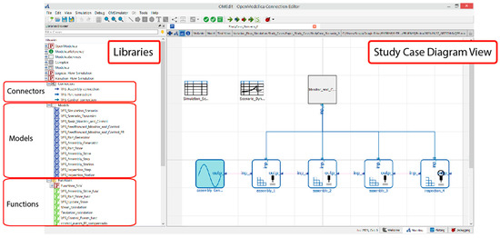 This section contains a synthesized description of the implementation of the previously presented SysML meta-model in the Modelica language using mainly textual code to define classes and connectors with sufficient detail for generating executable simulation models. Modelica also supports the graphical appearance definition of components using annotations. This resource provides a powerful mechanism to build complex objects of study, as in the case of the MAS, whose OpenModelica graphical view is shown in Figure 7. OpenModelica software has been used to carry out both the implementation of the reusable libraries expressed with the Modelica language and the construction and execution of the simulation models.