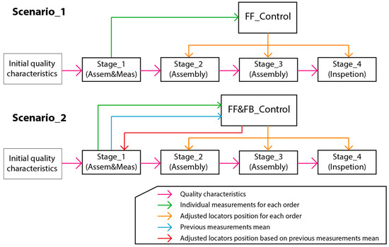 - Scenario_1: The in-process measuring capability of Stage_1 is used and, based on the measurement results, a VFS_FeedForward_Monitor&Control class calculates the optimal position of the locators in the subsequent stages for each assembly order to minimize the deviations obtained in the final inspection of each product. It must be also considered that the fixtures at Stages 2, 3, and 4 have actuators to adjust the position of each locator. For this reason, the setup times of these stages are modified to simulate the adjustment of the actuators.