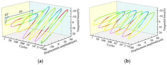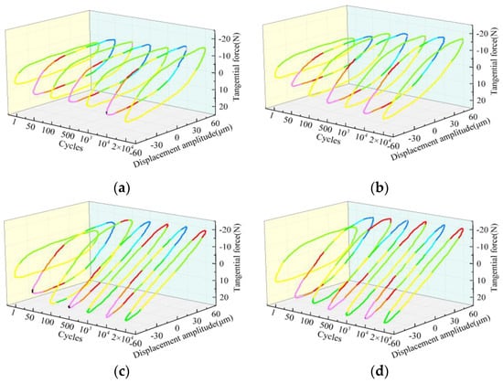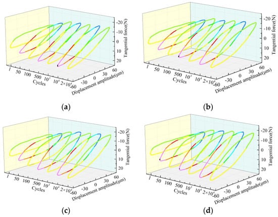 Figure 8a shows elliptical hysteresis loops at different loading cycles, which indicates that the fretting contact surface is mainly regulated by coupled elastic and plastic deformations []. Increases of loading cycles induce increases in the openness of hysteresis loop, relative slip range and plastic deformation. Figure 8b shows the increase in the area of hysteresis loop with increasing loading cycles, which reveals increases in the dissipation energy due to cyclic torsional loading with fretting contact and the fretting contact surface damage.