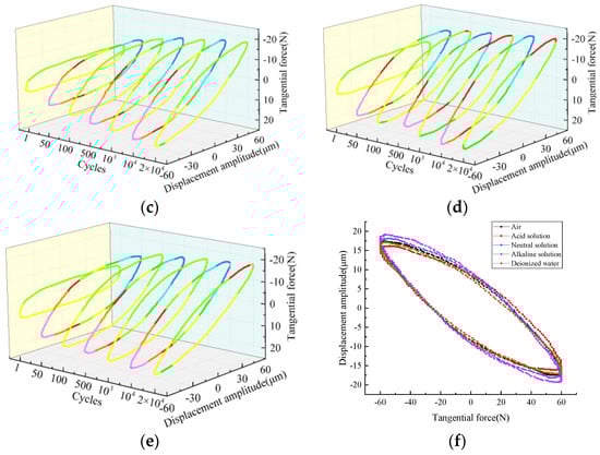 Ft-D loops during tension–torsion cyclic loading of steel wires with fretting contact in different environmental media. (a) air; (b) acid solution; (c) neutral solution; (d) alkaline solution; (e) deionized water; (f) comparison of hysteresis loops at loading cycles of 20,000.