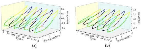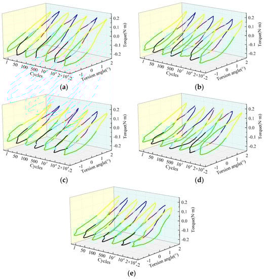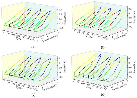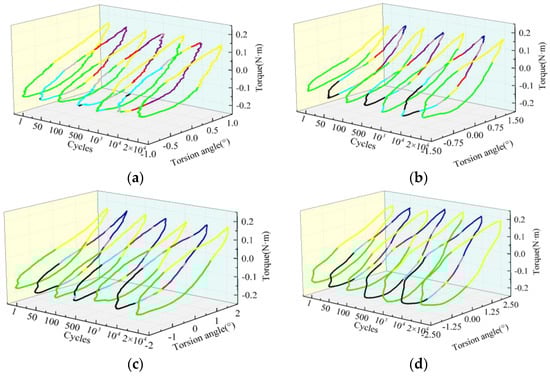 Figure 10a–d shows elliptical hysteresis loops of torque versus torsion angle in cases of different torsion angles. At each torsion angle, the openness of hysteresis loop increases with increasing loading cycles, which indicates that the cyclic torsional loading with fretting contact always runs at the partial slip state. At the same loading cycles, the openness of hysteresis loop increases with increasing torsion angle, which reveals increases in the relative slip and fretting contact surface damage. The nonlinear increase of torque with increasing torsion angle may be attributed to the elastic–plastic torsional deformation according to Material Mechanics and complex elastic–plastic fretting contact role []. At loading cycles of 20,000, dissipation energies due to cyclic torsional loading with fretting contact are 4.11 × 10−3 J, 6.73 × 10−3 J, 9.97 × 10−3 J and 17.0 × 10−3 J, respectively. Therefore, the dissipation energy and fretting contact surface damage of cyclic loaded wire both increase with increasing torsion angle.