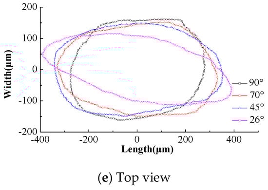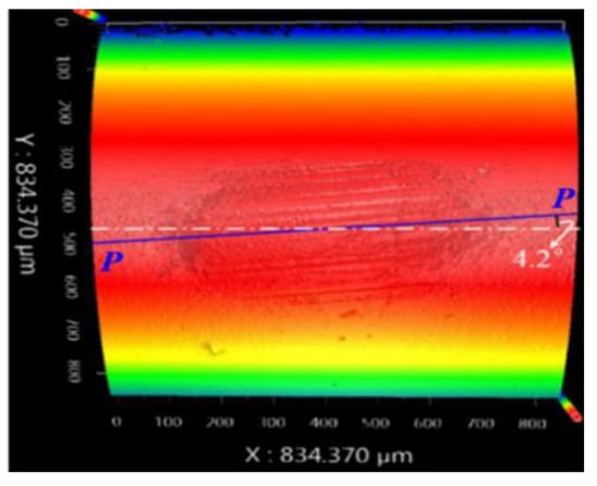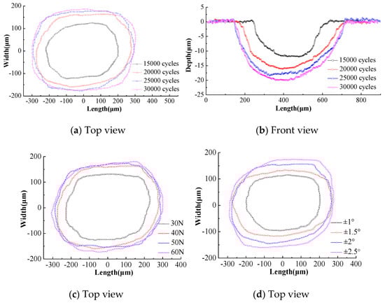 Figure 12 shows that wear scars of cyclic loaded wires all exhibit irregular ellipses. Coupled roles of tension and torsion induce certain inclinations between the cyclic loaded wire axis and long axis of elliptical scar. Different tension–torsion cyclic loading parameters (loading cycles, contact load, torsion angle and crossing angle) cause distinct inclinations attributed to distinct relative slips and torsional slips between contacting surfaces, which coincide well with results in Section 3.2.1 and Section 3.2.2. Table 7 and Table 8 show that as loading cycles, contact load, torsion angle and crossing angle increase, the maximum wear depth varies in ranges of 11.9–20.1 μm, 10.4–19.5 μm, 9.2–19.9 μm and 7.2–16.0 μm, respectively. Therefore, increases of tension–torsion cyclic loading parameters all cause the overall increases in wear scar dimensions, which coincides well with conclusions in Section 3.2.1 and Section 3.2.2.