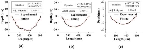 Based on wear depth profiles (Figure 3 and Figure 4 and Table 4) and polynomial fitting, theoretical equations of wear depth profiles are established as shown in Figure 5. According to theoretical equations of wear depth profiles, the three-dimensional geometric model of wear scar is reconstructed using Pro/Engineer 5.0, PTC, Massachusetts, USA (see Figure 5 in reference []). The wear volume between surfaces of P and Q can be calculated automatically by Pro/Engineer 5.0. Substitutions of wear volume, relative slip amplitude, loading cycles and contact load into formula (1) derives the cyclic wear coefficient, i.e., the wear volume per unit local relative slip and per unit contact load [,]: