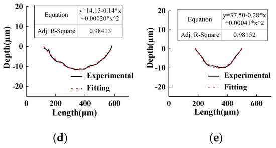 Fitting of wear depth profiles of cyclic loaded wires in cases of distinct environmental media. (a) Air. (b) Acid solution. (c) Neutral solution. (d) Alkaline solution. (e) Deionized water.