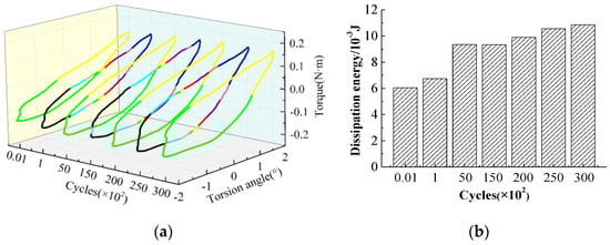 Evolutions and dissipation energy of torque versus torsion angle. (a) Evolution of the hysteresis loop. (b) Dissipation energy at loading cycles 20,000.