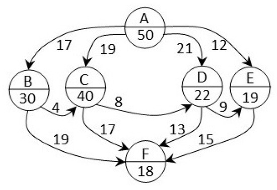 Definition 4. Layering. Given T, where each node has a positive width , a division by layers or levels of (also called stratification of ) is a partition of its set of nodes V within disjointed subsets , such that if , where and , then . A DAG with a stratification or division by levels is called a stratified digraph.