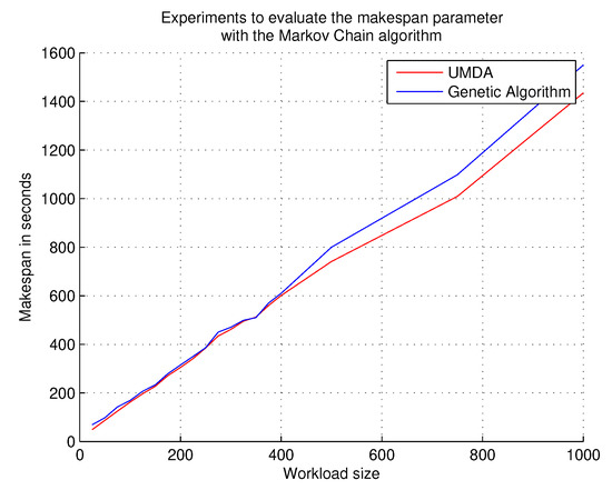 Figure 4. With the initial loads, the makespan was significantly different between the two algorithms, but as the number of PTGs increased, the similarity between the two algorithms increased. Due to these results, the number of PTGs was increased substantially (from 400 to 500, 750, and 1000) to observe the behavior of the results. The greater the increase in PTGs, the greater the distance in the results. This confirms that the response speed of the UMDA is proportionally greater than that of the genetic algorithm. Therefore, the response speed of the UMDA is substantially better than the genetic algorithm with different workloads.