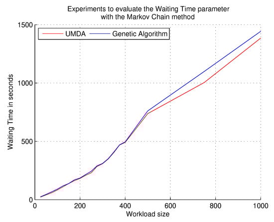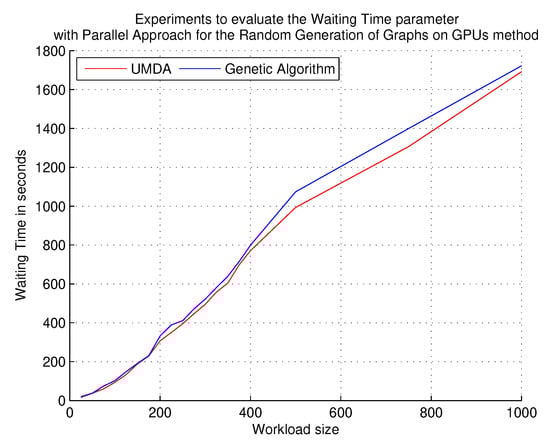 The evaluation parameter, waiting time, allows the observation of the time that tasks must wait before they can be served. It is an exponential parameter that increases as workloads increase the number of PTGs. The main objective of this test was to determine if the UMDA exceeds the waiting times of the genetic algorithm. The results of using the Markov Chain method and the parallel approach for the random generation of graphs on GPUs are shown in