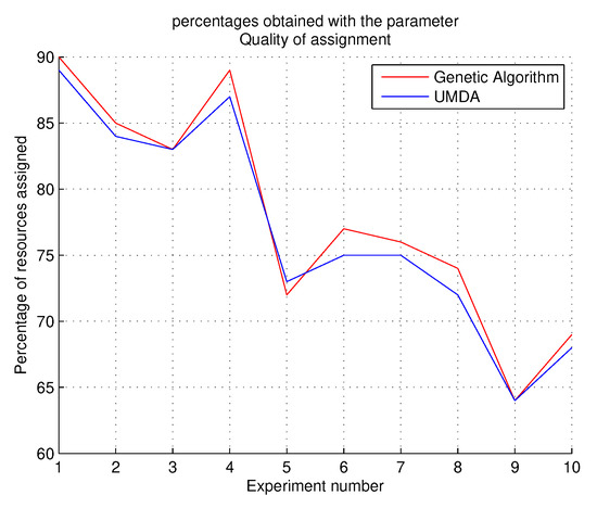 The percentages obtained were variable. When there is a large amount of resources available in the target system, the genetic algorithm manages to assign more tasks that use more resources in the allocation; however, when the number of available resources decreases, it consumes more time in the convergence, but maintains a high resource allocation. The advantage observed with the UMDA is that it can provide the allocation results in less time even when the amount of resources is limited in each allocation. We only provide one graph regarding quality of allocations because this research was not meant to measure this parameter; however, for comparison purposes, it is described.
