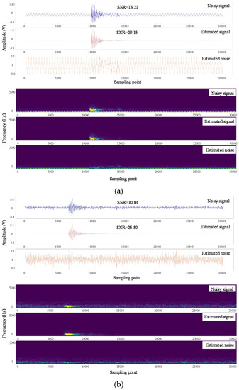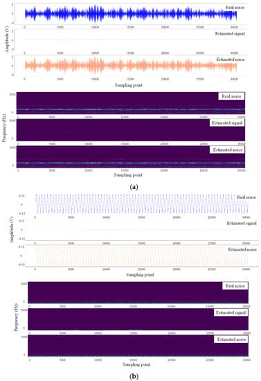 Denoising performance of CNN-denoiser for different types of real noise. The noises in the time domain and time–frequency domain are real noise, estimated signal and estimated noise from top to bottom of each sub-figure. (a) Mixture of cyclic noise and other noise; (b) cyclic noise.