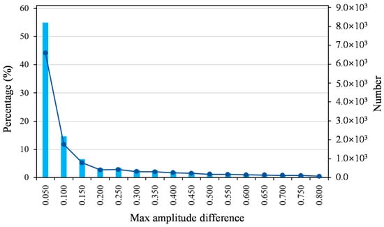 The proposed model not only learns the features of microseismic signals but also estimates noise. To validate this, the CNN-denoiser was tested for 12,000 real noise samples. Figure 4 shows the robustness of the neural network to some periodic non-microseismic signals (the frequency band varying with time). No estimated signals are predicted, and the estimated noise is almost equivalent to the input noise sample. It indicates that the CNN-denoiser can automatically produce a mask that adapts to the noise characteristics. The mask reflects the changes in frequency characteristics over time, as well as the frequency band of noise. Additionally, the distribution of the max amplitude difference between the real and estimated noise samples is shown in Figure 5. The results show that the max amplitude difference of more than 50% of noise samples is less than 0.05, which means the method only causes minor waveform distortion.