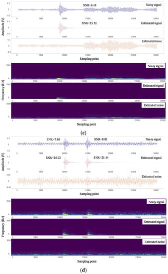 Denoising examples of different recorded noisy signals in Zijing tunnel (China). The signals in the time domain and time–frequency domain are noisy signal, estimated signal, and estimated noise from top to bottom of each sub-figure. (a,b) Microseismic signals with cyclic noises at different frequency; (c) microseismic signal with a mixture of cyclic noise and other noise; (d) noisy signal contains more than one microseismic waveform.