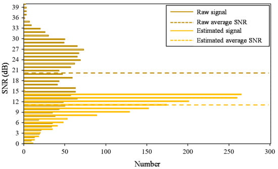 where and are peak amplitudes of signal and noise, respectively. As shown in Figure 6, the proposed method provides an excellent denoising performance for microseismic signals with various noise in terms of the improvement of the SNRs, good shape recovery, and amplitude characteristics, even one noisy signal contains more than one microseismic waveform (Figure 6d). The average SNR of the 1510 noisy signals after denoising is increased by 8.48 dB, and the maximum improvement up to 36.21 dB (Figure 7). In addition, the shape and amplitude characteristics of the estimated noise are well preserved. Although the CNN-denoiser is trained on semi-synthetic data, it could well be extended to real noisy signals. This suggests that the proposed method in this study can be directly applied to actual engineering for denoising tasks.