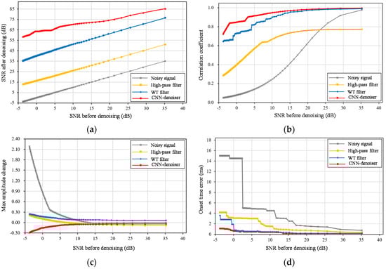 Compared with the high-pass filter and WT filter, the proposed CNN-denoiser outperforms SNR improvements with a maximum of 64.85 dB (Figure 9a). The highest correlation coefficient of estimated signals indicates that the WT filter and CNN-denoiser causes smaller waveform distortion during denoising, and the performance of the latter is better than the former. In contrast, the high-pass filter method introduces high waveform distortion, so that the maximum correlation coefficient only reached 0.86 (Figure 9b). CNN-denoiser provides the highest correction coefficient, especially for low SNRs. Figure 9c shows that the absolute value of max amplitude changes of the estimated signals by the high-pass filter and CNN-denoiser are almost similar when the SNR is less than 10 dB. However, the CNN-denoiser is superior to the high-pass filter in terms of the max amplitude changes of noisy signals with high SNRs, indicating that the max amplitude of the estimated signal is closer to the clean signal in Figure 8. Moreover, the max amplitude change caused by the WT filter is the largest in the test. The STA/LTA method is applied to pick up the onset time of the noisy signal and that denoised by the high-pass filter, WT filter, and CNN-denoiser. As shown in Figure 9d, the accuracy of the onset time picking is significantly improved with the high-pass filter, WT filter and the CNN-denoiser, where the CNN-denoiser outperforms the others for low SRNs. It represents an improvement compared with the STA/LTA methods.