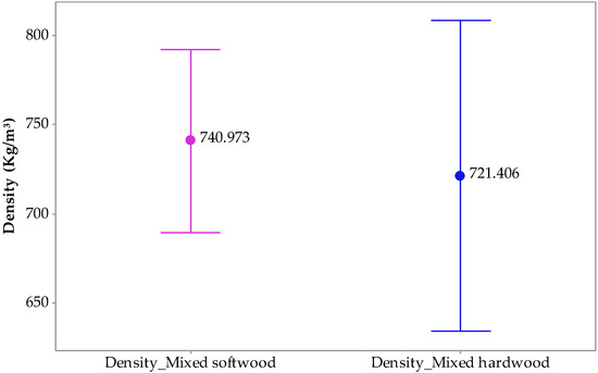 The moisture content of the boards, determined in accordance with European standards (EN 322), was around 10%. The density of OSBs made of mixed softwood species was higher than the density of OSBs made of mixed hardwood, although the estimated mean values of the densities were similar for a confidence interval of 95%: the estimated median values for softwood OSBs were 753.8 kg/m3 and for mixed hardwood OSBs 719.1 kg/m3. Similar densities were found by the Barbirato group [7] and Okino [30], with a 0.8–1.0 compression coefficient related to wood species density. Additionally, it can be noticed that the differences between board properties are not statistically significant, and a high variation of density for OSBs made from mixed hardwood is caused by the difference in the analyzed sample sizes. The interval plot of density for each type of analyzed OSBs is plotted in Figure 2.