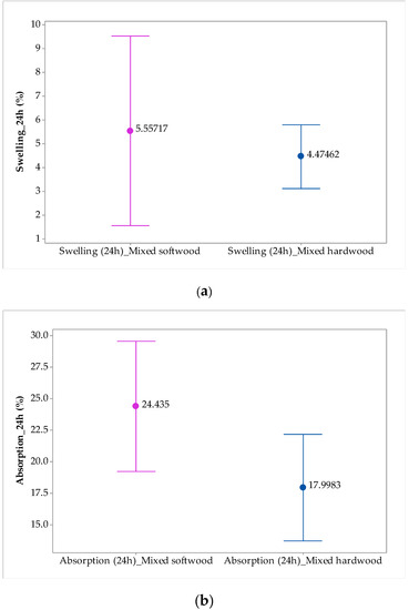 In order to compare the properties of OSB boards, the mean values were considered (displayed by interval plots diagrams). The analyses of the physical and mechanical properties of OSBs were statistically analyzed using Minitab 17 software (Minitab LLC, State College, PA, USA). The analysis consists of comparing the OSBs made of softwood and hardwood mixtures by applying interval plots with a confidence interval (CI) of 95% in order to underline the differences between the main properties of the OSBs under study.