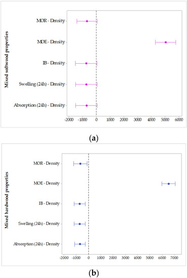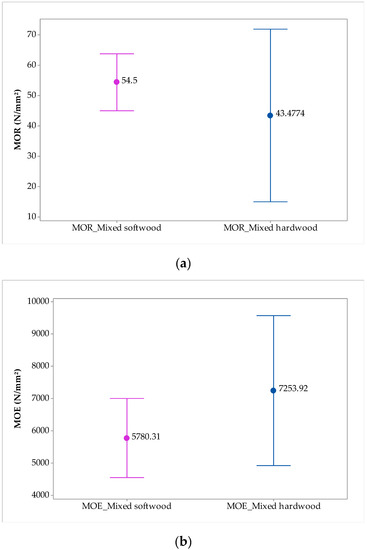 Regarding the MOE properties, the hardwood OSBs present superior MOE values, with a mean of 7253 N/mm2, while softwood OSBs reveal lower properties (MOE = 5780 N/mm2). This fact is shown by the estimated mean values for the analyzed types of OSBs (Figure 4b).