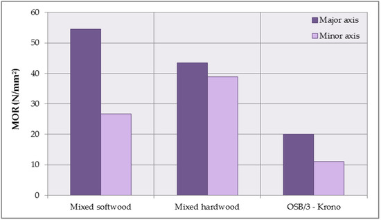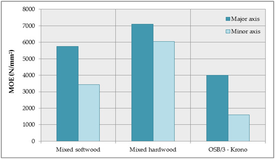 The comparative analysis of the MOR and MOE properties that are specific to the major and minor axes is presented graphically in Figure 5 and Figure 6. Analyzing the modulus of rupture, it can be observed that the obtained values exceed the specified value of OSB/3–Krono. Additionally, higher values were obtained for OSBs made of mixed softwood species.