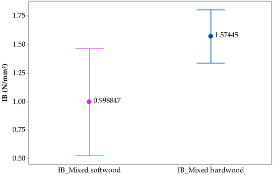 Outdoor OSBs are usually tested by internal bond, both for dry boards and for boards boiled in water for 2 h.The interval plot of internal bond properties for analyzed OSBs indicates that hardwood OSBs display higher IB properties than softwood OSBs. High values of mean (1.57 N/mm2) and median (1.629 N/mm2) for IB properties were estimated in the case of mixed hardwood OSBs. Based on the estimated statistical parameter and interval plots with 95% CI, the analysis indicates that the difference is not significant (Figure 7).