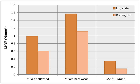 The diminishing strength of the internal bond after boiling in water was different from one group of species to another, as seen in Figure 8. It is observed that the decrease in IB was 38% for the softwood species mixture and 28% for the hardwood species mixture. These small differences show that the loss of strength by boiling does not depend on the group of species, but on the adhesive and other hydrophobic substances used. In this paper, the same adhesive recipe was used for all analyzed OSBs, which is why the adhesive factor was removed from the analysis. Additionally, in the case of these determinations, the obtained experimental values exceeded the minimum values of the Kronospan factory (OSB/3), and they are similar to the values obtained by other authors [26].
