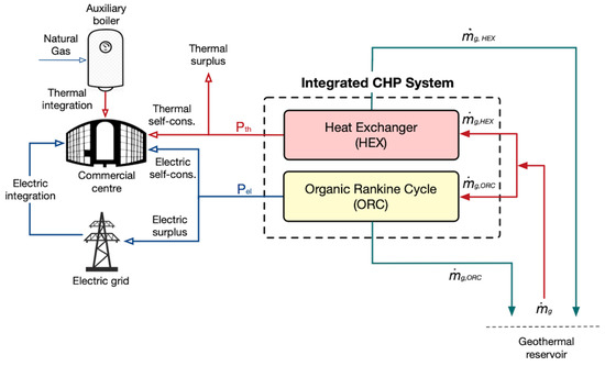 Figure 1 highlights the scheme of the geothermal-driven system used to satisfy the energy requests of a commercial centre located in Southern Italy. In particular, the investigated area refers to the Phlegraean Fields where high temperature geothermal aquifers are present at a very shallow depth [77,78]. The system consists of an organic Rankine cycle (ORC) for the electric production and a heat exchanger (HEX) able to provide the thermal energy. The two components work in parallel and simultaneously and the total geothermal mass flow rate can be arranged between the ORC and HEX units according to the user energy demand. To this purpose, the geofluid is pumped to the two components from the geothermal reservoir and afterwards is reinjected into the ground.