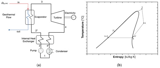 The main components of an ORC are a pump, an evaporator, a turbine, and a condenser (Figure 2a) [85,86]. The pump increases the pressure of the organic working fluid to the maximum value (1-2 process) then the evaporator is adopted to obtain the superheated vapour (2-3) that expands in the turbine (3-4) to provide the mechanical work that is converted into electricity by an alternator. Finally, the working fluid is condensed (4-1). An internal heat exchanger (IHE) is often used to improve the system efficiency [87]. To this purpose, the energy content of the organic fluid at the exit of the turbine is exploited (4-4*) to preheat the liquid before the entrance in the evaporator (2-2*). Specifically, centrifugal pumps, radial turbine and shell and tube heat exchangers were selected, according to the literature [19,88,89,90]. Figure 2b depicts the different processes in the T-s diagram.