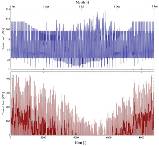 The integrated geothermal system was adopted to satisfy the energy request of a commercial centre in Southern Italy [112]. The yearly electric and thermal demands were equal to 533.1 MWhel and 396.3 MWhth, respectively. The electric load depended mainly on the lighting system and heating, ventilation, and air conditioning (HVAC) units, while the thermal demand was based on space heating and hot water request. The analysis was performed on an hourly basis and the electric and thermal loads during the year are depicted in Figure 3. The highest electric request (144.0 kWhel) was registered in August when the thermal demand was absent or presented the minimum values. As expected, the maximum heat load (427.9 kWhth) was noticed in winter, owing to the space heating demand.