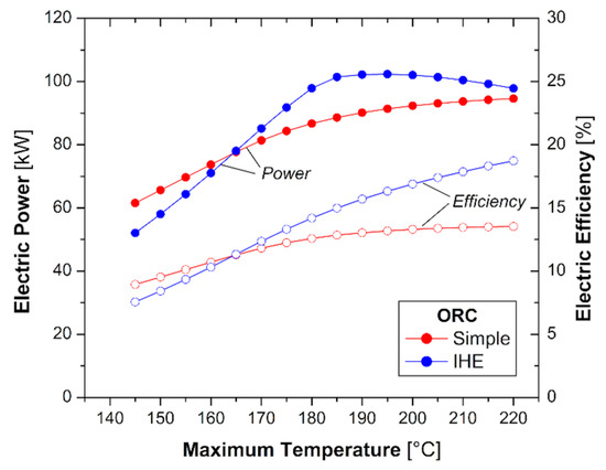 First, a parametric investigation was carried out, and the effect of the maximum temperature (Tmax) on the ORC performance was analysed. The maximum pressure was fixed to 65.3 bar (1.80 pcrit) while the condensation temperature was set to 30 °C. As expected [29], a continuous increase in the ORC electric efficiency with the maximum temperature was noticed for both simple and regenerative configurations (Figure 4). The simple arrangement guarantees higher performance for temperature values lower than 165 °C and a plateau (ηel ≈ 13.4%) was reached for Tmax higher than 200 °C. Conversely, the IHE configuration guarantees a significant raise in the electric efficiency when the temperature moves from 140 °C to 220 °C (6.7% to 18.7%, respectively) while the maximum electric power (102.3 kWel) is registered when the temperature at the turbine entrance is equal to 195 °C.