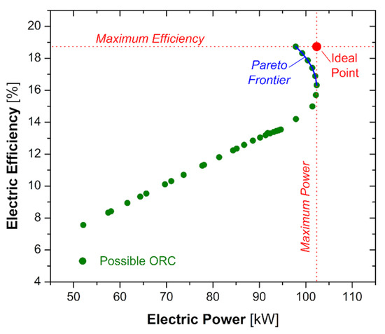 A multi-variable optimisation was adopted to select the most suitable configuration of the ORC geothermal-driven apparatus, and the electric power and efficiency have been considered as objective parameters. Figure 5 highlights that a Pareto frontier exists and the “minimum distance” criterion was adopted to define the proper ORC arrangement according to the literature [120,121]. The method suggests selecting the system configuration that minimises the dimensionless distance to the ideal point (the red circle in Figure 5) that is characterised by the maximum ORC electric efficiency (ηel,ORCmax) and the maximum electric power (Pel,max), according to the following equation:
