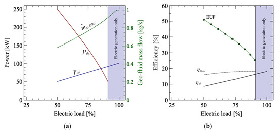 Figure 6a highlights the geothermal flow used in the ORC, the electric and thermal power of the integrated CHP system as a function of the electric load. Furthermore, the energy utilisation factor, the marginal efficiency, and the electric efficiency are plotted in Figure 6b. In particular, the minimum electric load is equal to 50%, owing to the constraints of the minimum pressure at the ORC turbine inlet (1.03 pcrit). The corresponding electric and thermal power are equal to 50.7 kWel and 249.5 kWth, whereas electric efficiency is 8.7%. A slight variation in the marginal efficiency is observed (from 16.0% to 17.7%) whereas EUF is more sensitive to the load and ranges between 25.2% and 50.9% (Figure 6b). The geothermal temperature at the exit of the evaporator ranges between 95.9 °C (at full load) and 70.0 °C (at minimum). For this purpose, it is worth noting that the adopted parallel arrangement permits to satisfy the high-temperature heat request for all the operating conditions.