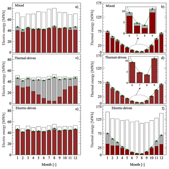 Monthly electric and thermal balances for mixed (a,b) thermal- (c,d) and electric-driven (e,f) strategy.