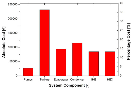 Furthermore, the economic viability of the integrated energy system was analysed and the different operating strategies were compared. To this purpose, the investment period was fixed to 20 years and the main assumptions for the economic investigation are summarised in Table 3. The cost of the integrated CHP system (ORC and HEX sub-systems) was evaluated equal to EUR 636,786 adopting the bare model cost [113]. Specifically, the initial investment for the selected supercritical ORC unit was evaluated equal to EUR 551,838, with a specific cost lower than 5500 €/kWel, while the cost of the HEX sub-system corresponds to about EUR 85,000. The absolute and percentage costs of the different components are visible in Figure 9. The turbine revealed the highest rate (36.5% of the integrated system), whereas the share costs of the four heat exchangers were similar and ranged between 13.3% of the HEX unit and 18.0% of the condenser. The pumps costs correspond to about 4%.