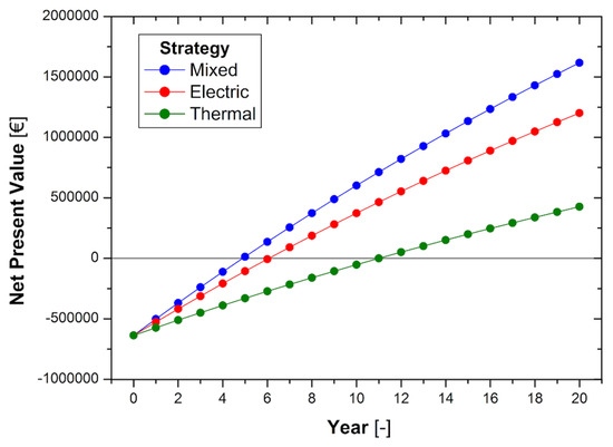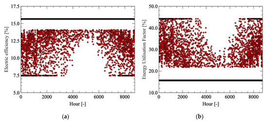 On the contrary, the thermal-driven strategy guarantees a higher mean load (80.6%) with fewer operating hours (3692 h/year) because the thermal request is limited to the central hours of the day. This circumstance corresponds to lower equivalent operation hours (2977) as compared with the electric mode (6028). It is worthy to note that the mixed strategy reduces significantly the thermal dumping producing only electric energy at full load when the thermal request is absent. At the same time, the system operates in the high-performance range with 92.4% mean load and 8095 equivalent hours of operation. A slight excess of electric energy is noticed, due to the difference in the production and request timing.