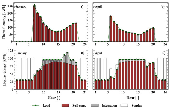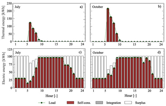 Figure 8 shows the annual balance for the three operating modes. The mixed strategy satisfies both thermal and electric demand with small integration (4.7% and 9.3% of the thermal and electric load, respectively) with 59.2% electric surplus and no thermal dumping. If the heat-driven mode is used, the integrated CHP apparatus is able to satisfy up to 95.7% of the thermal demand, while the electric self-consumption drops to 47.5%.