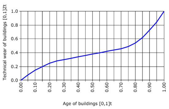 The so-called Lorenz curve illustrates the typical course of the wear process of building elements during their operation [26,27,28]. In this process, we can distinguish the following three basic intervals of a building’s age t and the corresponding intervals of technical wear Zt—Figure 1:
