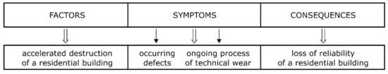 The general scheme of the cause-and-effect model—“defect–technical wear of building elements”—is the result of a synthesis of the results of visual studies of a selected sample of tenement houses in Wroclaw’s Srodmiescie district. The scheme of the considered model at the level of greatest generalization is as follows: