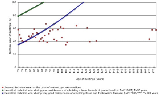 The adopted model and method of testing a representative group of downtown residential buildings with a traditional construction, which were erected at the turn of the 19th and 20th centuries, indicate that the age of the elements of old residential buildings is of secondary importance in the process of the intensity of loss of their serviceability value. No more than 30% of the element’s damage can be explained by the passage of time if we assume that the coefficient of determination is the measure of the adjustment of the mathematical models (as a function of the technical wear of building elements over time), which are tested in the nonlinear regression method. Therefore, it is not age that determines the course of the technical wear of the analysed building components.