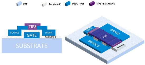 Fabricated OFETs have a bottom gate-bottom contact structure, shown in Figure 1. Two different substrates were employed: 175-μm-thick polyethylene terephthalate (PET, Goodfellow) and 700-nm-thick Parylene C substrates. The latest were fabricated by depositing Parylene C with a PDS 2010 Labcoater 2 (Specialty Coating System, Indianapolis, IN) over 175-μm-thick PET substrates, previously coated with 1:50 water solution of an industrial soap (Micro-90 Concentrated Cleaning Solution, International Corporation, Burlington, NJ). Before printing, both kinds of substrate were cleaned with acetone and ethanol (Sigma Aldrich) and dried with nitrogen. Gate electrodes were inkjet-printed using a Dimatix Materials Printer DMP2831 (Fujifilm Dimatix, Lebanon, NH). A 16-nozzle cartridge with single drop volume of 1 pL (DMC11601, Fujifilm Dimatix) was filled with PJET HC (Heraeus, Hanau, Germany), a commercially available, Poly(3,4-ethylenedioxythiophene)-poly(styrenesulfonate) (PEDOT:PSS)-based ink. Three nozzles, biased with a firing voltage of 25 V, were employed for patterning gate lines of 10 × 2 mm2, defined by the overlap of two subsequently printed layers. A drop spacing of 20 μm was set, and the printer platen was maintained at a fixed temperature of 60 °C. The gate insulator is a 250 nm-thick Parylene C film, deposited by CVD using the previously cited PDS 2010 Parylene coating equipment. In this case, an adhesion promoter (A-174 Silane, Specialty Coating Systems, Indianapolis, IN) was inserted in the deposition chamber to improve the quality of the deposited film. It is worth noting that this technique is perfectly compatible, in terms of throughput and area, with inkjet printing [34,35], and can be possibly extended to roll-to-roll fabrication processes [36]. The final insulating capacitance is of 10 nFcm−2.