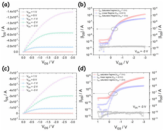 Typical output (a) and transfer characteristic curves (b) of OFETs fabricated over 175 μm-thick PET substrates; typical output (c) and transfer characteristic curves (d) of OFETs fabricated over 700 nm-thick Parylene C substrates.