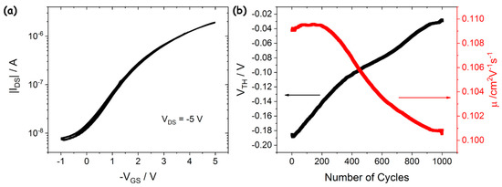 (a) 1000 double-sweep transfer characteristic curves acquired in saturation regime at VDS = −5 V; (b) threshold voltage (black, left axis) and mobility (red, right axis) absolute variations extrapolated by the square root of curves in (a).