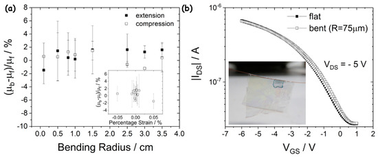 where tsub and td are substrate and device thickness, respectively, η = td/tsub and χ = Yd/Ysub, being Yd and Ysub the Young’s moduli of device and substrate, respectively, and R is the bending radius. It is noteworthy that, as strain is directly proportional to the overall device thickness (tsub + td), the strain produced by a certain deformation on a sub-micrometrical OFET can be very low even for low values of R. In order to demonstrate that device performances are substantially stable with bending, ultra-thin OFETs have been bent at different bending radii (R = 3.5, 3, 2.5, 1.5, 1, 0.8, 0.5, 0.1 cm), both in extension and in compression. In extension, a tensile strain is applied on the organic semiconductor, and this would bring a reduction in charge carrier mobility due to the displacement of crystalline domains in the film. On the contrary, when the device is compressed, the local density of crystalline domains in the organic semiconductor film increases, thus bringing an increase in the charge carrier mobility. Results are reported in Figure 4: in Figure 4a, relative charge carrier mobility variations with the applied bending radii are reported, calculated as (μb − μf)/μf (μb and μf are charge carrier mobility values in bent and flat conditions, respectively). In both extension and compression, average fluctuations of mobility values in the range of 2% were recorded, without any evident trend with applied deformation in both cases, thus demonstrating that complete mechanical stability has been obtained. This is consistent with the fact that, although the significant deformation applied, the surface strain applied in both cases is very low (as high as 0.05%) as the whole device thickness is much lower than the applied deformation. The overall stability of devices can also be demonstrated for an extreme deformation, obtained by bending the device over a copper wire with a nominal diameter of 150 μm. A plot showing the actual transfer characteristic curves of a device in flat conditions (black solid squares) and during bending (black open squares) is reported in Figure 4b. Curves are almost completely overlapped, with a minimum shift in the threshold voltage and OFF current increase, which can be ascribed to the measurement setup (devices are connected to quite long conductive wires in order to allow such an extreme deformation). These results further demonstrate the complete mechanical stability of the device.